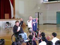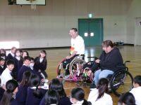 11月 4 日(火)に、1年生対象の人権学習の一環として、車椅子バスケットボールで 2004 年に開催されたアテネパラリンピックに日本代表として出場された阪根泰子さんと車椅子バスケットボールクラブ KYOTO UPS の東武志さんを講師にお招きし、ご講演いただきました。また、生徒たちは競技用車椅子に乗り、実際に車椅子バスケットボールを体験しました。