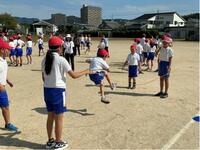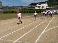 5・6年の体育を見に行きました。100m走の練習をしていると思っていたら、何かが始まりました。子どもたちが一生懸命になり、楽しめる団体競技になりそうです。