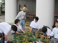 学校支援地域本部(地域ボランティア)と生徒会生活委員が夏の花の植えかえ作業をしました。