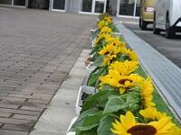 ミニ向日葵とマリーゴールドで正門が明るくなりました。