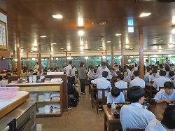 バスで牧島までやって来て、艇長さんにオールの使い方から学び、担任の先生の打つ太鼓の音に合わせて
