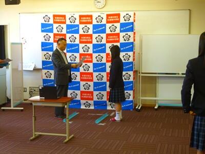 2月26日(木)に伝達表彰を行いました。各種大会やコンクールにおいて優秀な成績を収めた生徒の皆さんに、校長先生より賞状が手渡されました。オンラインでの実施となりましたが、他の生徒の皆さんは教室から温かい拍手を送っていました。今後もそれぞれの目標に向かって努力を続けてほしいと思います。