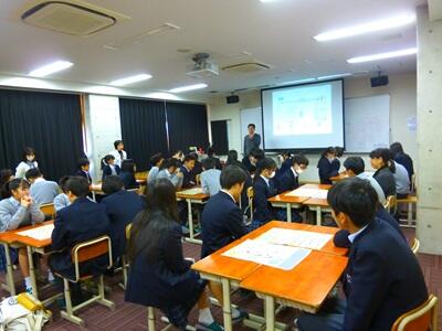 グループディスカッションの後、前方のモニターに意見を映写して発表しました。