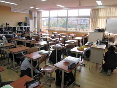 教室では、それぞれの机の下に入り、身を守りました。