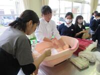 木津川市の健康推進課、子ども家庭支援課の方に来ていただき、1年生でいのちの学習を行いました。グループに分かれて、実際に赤ちゃん人形を沐浴したり、抱っこすることで、子育ての大変さを味わったり、将来に向けたライフデザインについて考える機会となりました。
