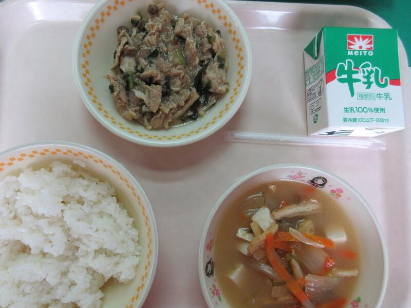 今日の献立 ごはん 豚肉のおろし炒め なめこ汁 牛乳 でした
