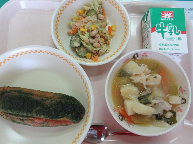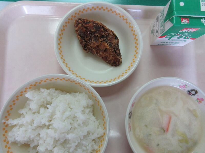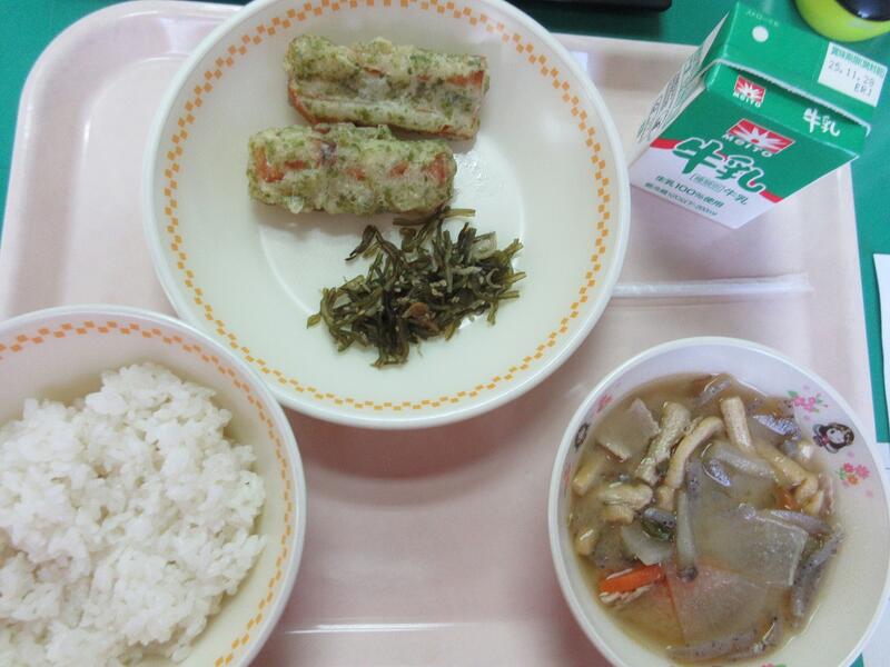 11月17日の献立 ごはん ちくわの磯辺揚げ 茎わかめの炒め煮 豚汁 牛乳 でした