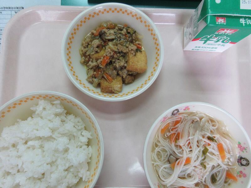 今日の献立 ごはん 厚揚げのカレーだしあんかけ ビーフンのにゅうめん 牛乳 でした