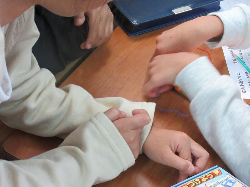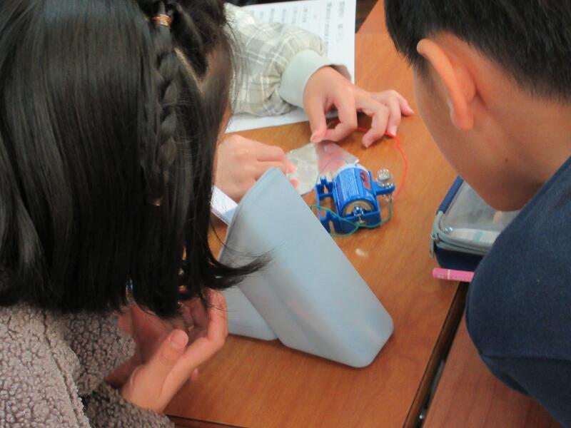 早速班ごとに銀色、金色の折り紙が電気を通すか試してみました。結果は・・・・(^^♪