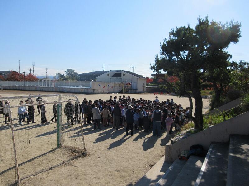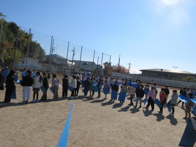 スカッとした秋晴れの中、全校児童が運動場に集まって、創立35周年記念の写真撮影を行いました。