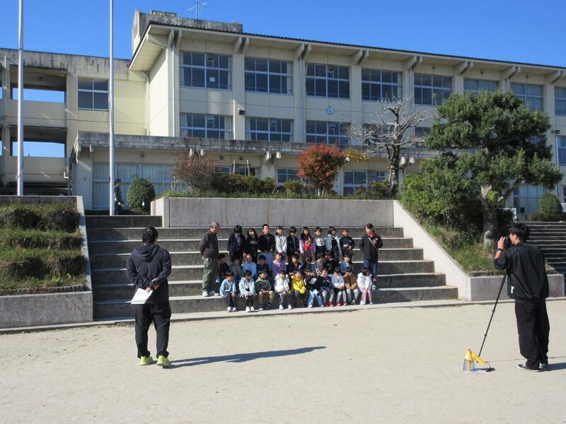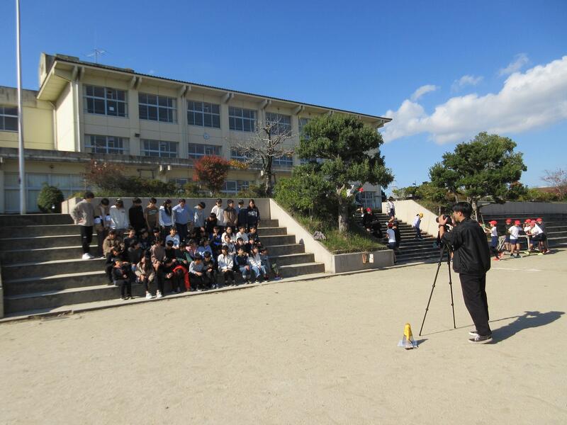 2階 多目的ホールから、全校児童の集合写真撮影を行いました。そののち、学年ごとの集合写真も撮っていただきました。