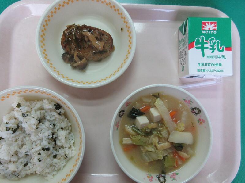 今日の献立は 麦入りわかめご飯 和風きのこハンバーグ 小松菜の味噌汁 牛乳 でした