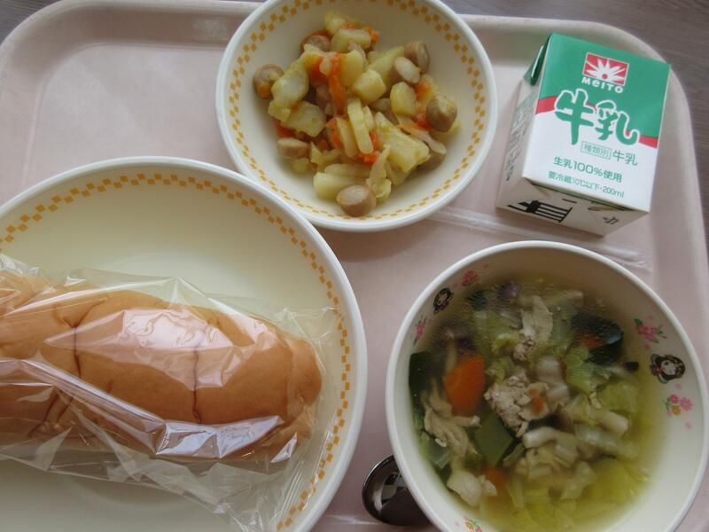 今日の献立 コッペパン ジャーマンポテト 白菜のスープ 牛乳 でした