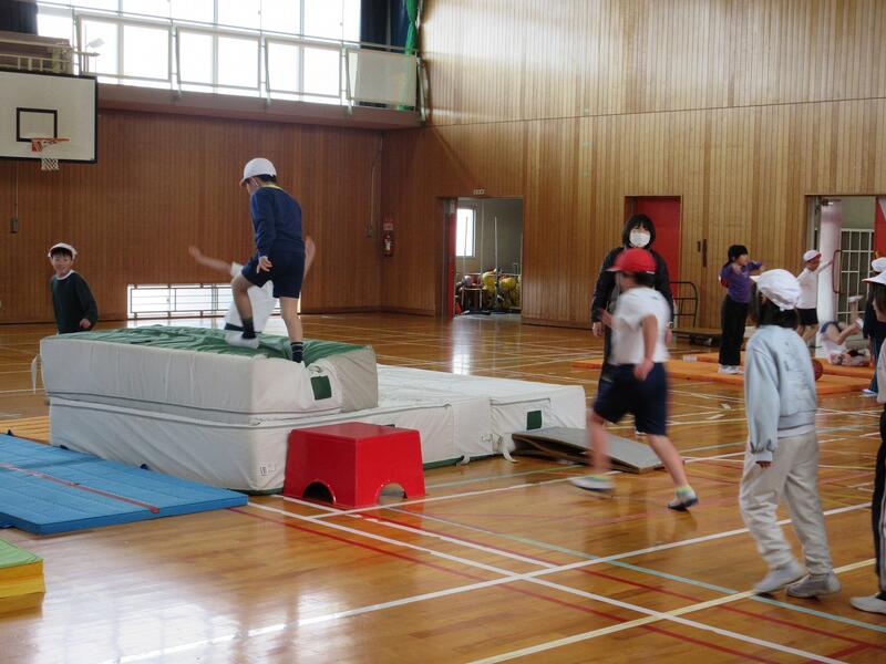 3年生は体育館での体育中。台上前転に取り組んでいますが、いろいろな場の設定で、「こわいなあ」がクリアできているようです。