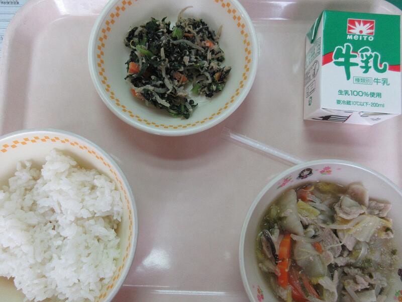 今日の献立 ごはん みぞれ鍋 小松菜ともやしののり酢和え 牛乳 でした
