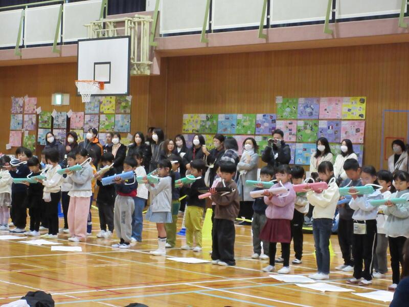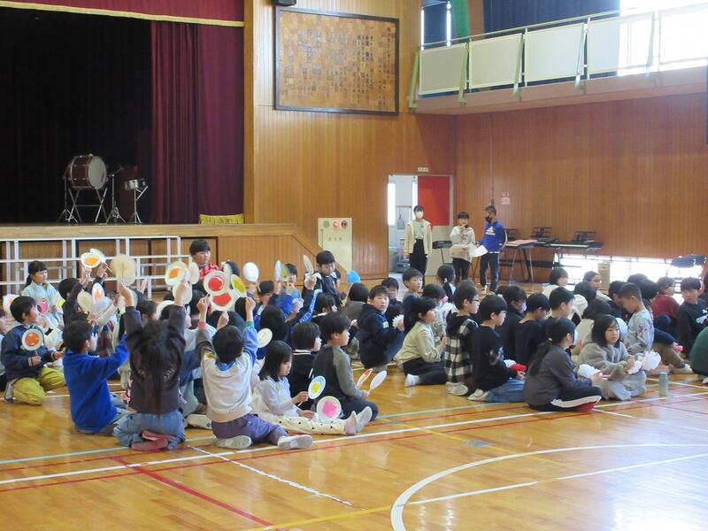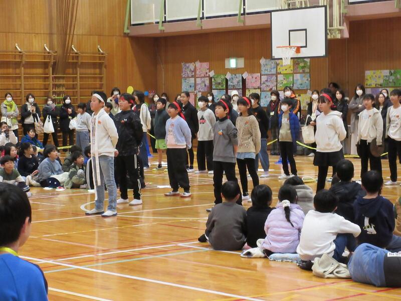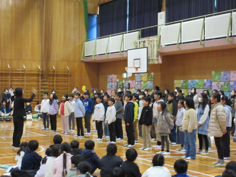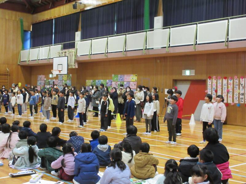 1年生から4年生も、5年生の指示をよく聞き、呼びかけたり、歌ったり。いい声が出ています。