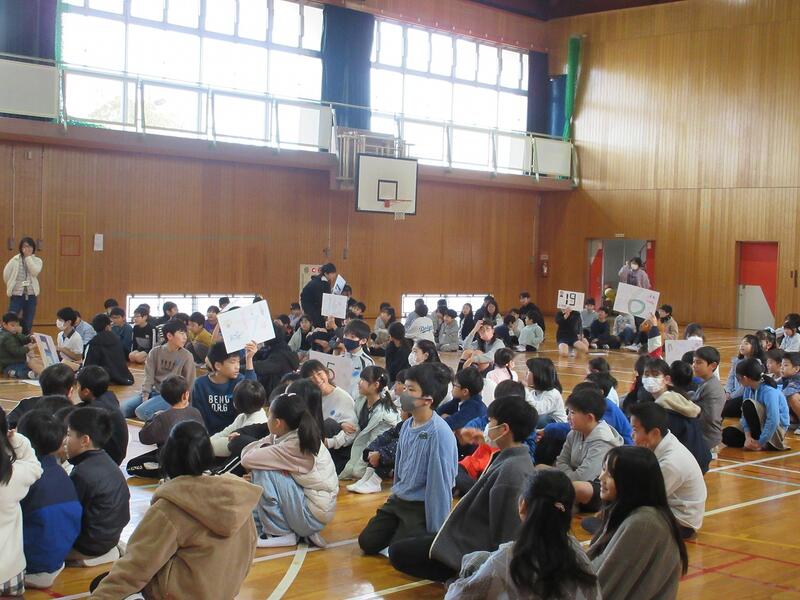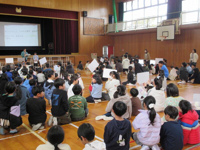 生き物や草花についてのクイズを8問考えてくれた飼育園芸委員会のみんな。1年生から6年生まで楽しめる内容で、コスモス班グループ対抗で行いました。