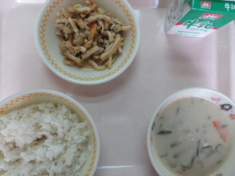 今日の献立 麦ごはん こぎつね丼の具 京風かす汁 牛乳 でした