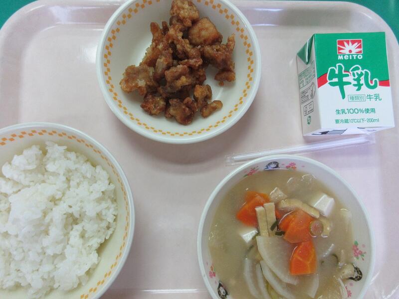 今日の献立 ごはん 鶏肉の揚げ漬け 大根の味噌汁 牛乳 でした