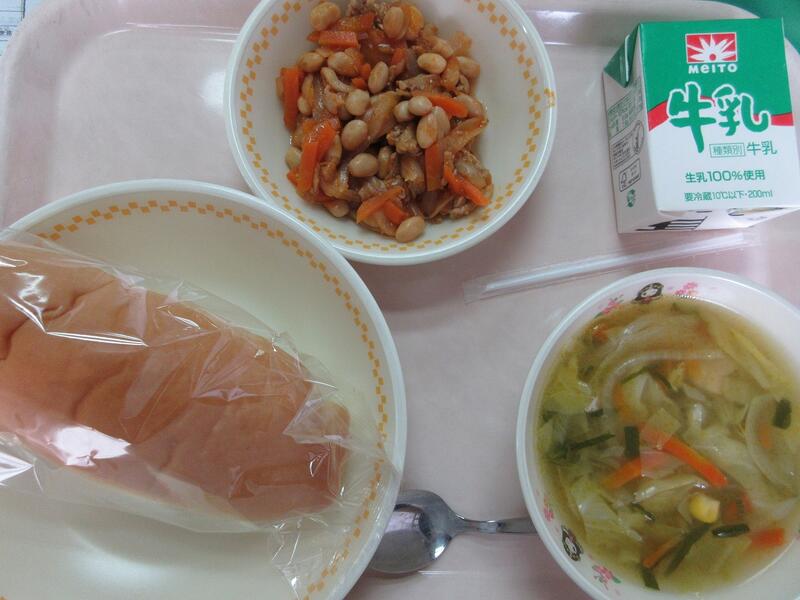 今日の献立 コッペパン 豚肉と大豆のケチャップ炒め 野菜スープ 牛乳 でした
