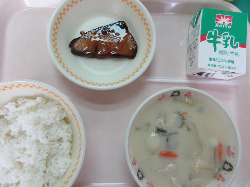 今日の献立 ご飯 白身魚の野菜あんかけ さつま汁 牛乳 でした