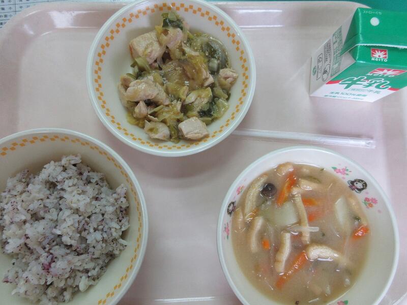 今日の献立 鶏ごぼうおこわ 鶏肉の照り焼き たぬき汁 牛乳 でした