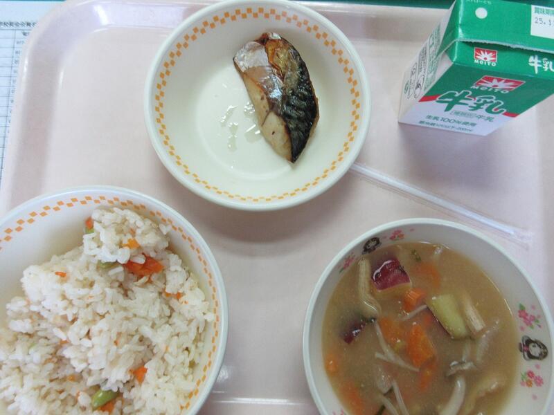 今日の献立 吹き寄せご飯 さばの塩焼き 秋野菜の味噌汁 牛乳 でした