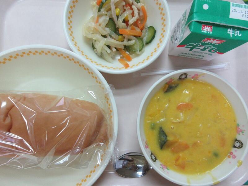 今日の献立 コッペパン かぼちゃのクリームシチュー だいこんのフレンチサラダ 牛乳 でした
