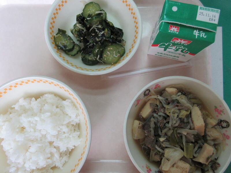 11月17日の献立 ごはん ちくわの磯辺揚げ 茎わかめの炒め煮 豚汁 牛乳 でした