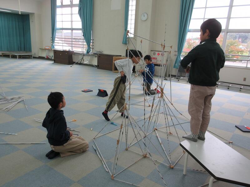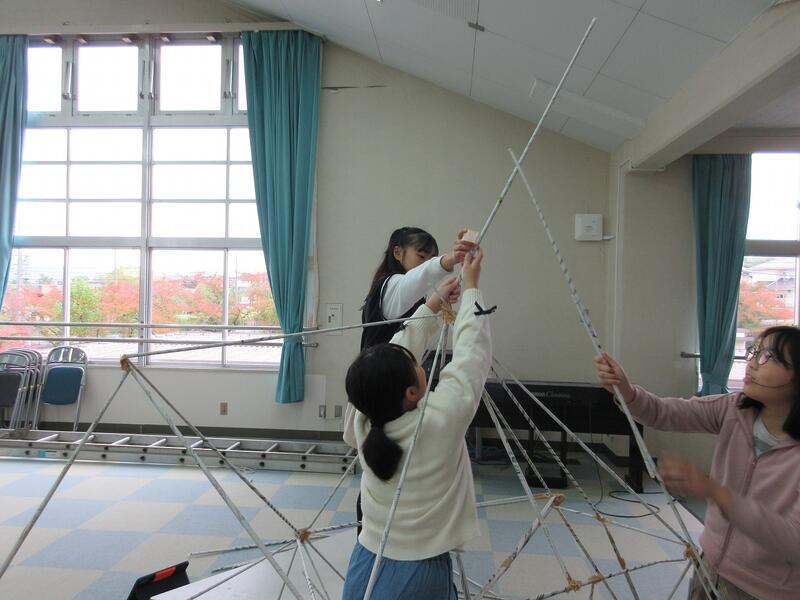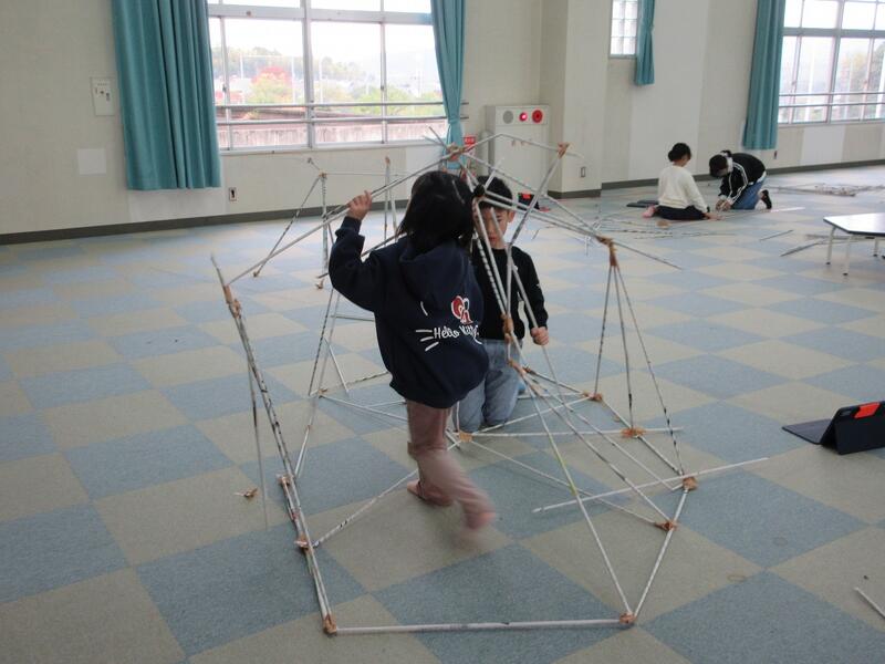 4年生の図工科で、棒状の新聞紙を組んだり立てたりする造形活動に取り組んでいます。