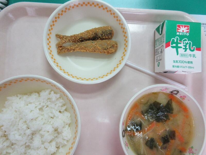 今日の献立 いわしのポテト衣揚げ 骨太味噌汁 ごはん 牛乳 でした