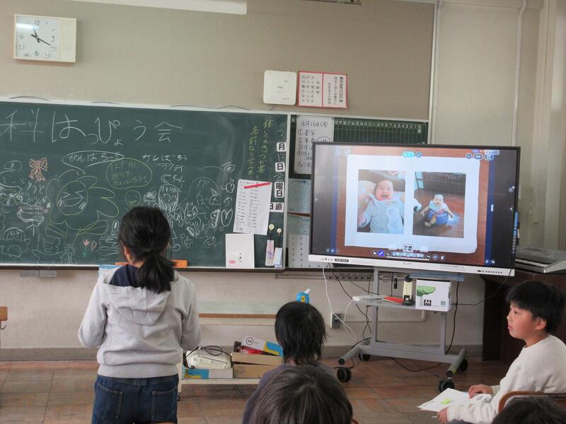 最初に、一人一人の成長を振り返りました。赤ちゃんの頃の写真を見ながら、「かわいい!」と口々につぶやいていました。赤ちゃんの頃夢中だったこと、そして今、好きなことを発表しました。