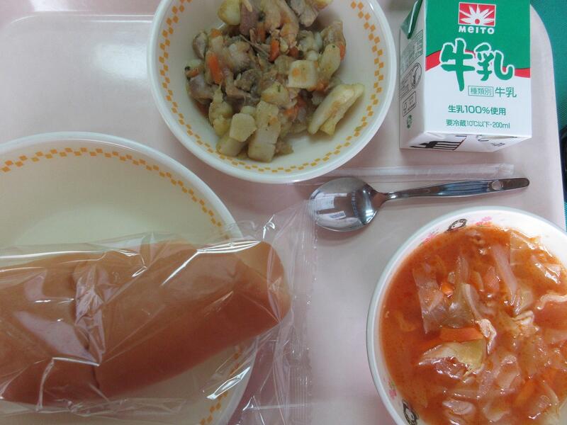 今日の献立 コッペパン チキンとポテトのハーブ炒め ミネストローネ 牛乳 でした