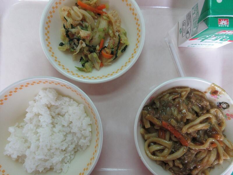 今日の献立 少なめのごはん カレーうどん キャベツのおかか和え 牛乳 でした