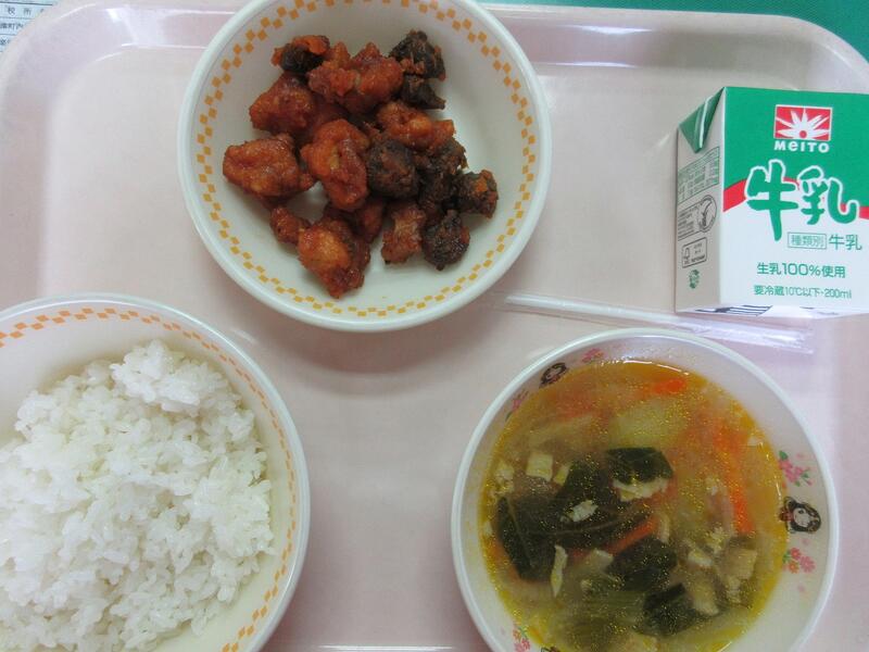 今日の献立 ごはん とりとレバーのレモンチリソース チンゲンサイのスープ 牛乳 でした