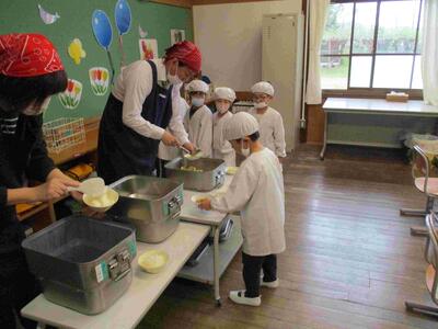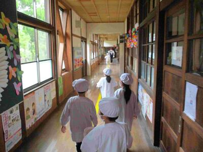 重たい給食も、みんなで手分けして大切に運びます。
