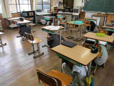 放送があると、みんな机の下に入り、頭を守りました。