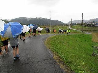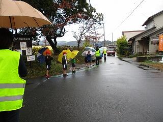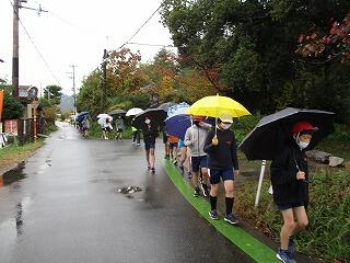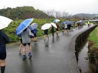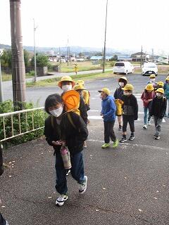 11月11日(木)、朝から小雨が降ったりやんだりするお天気でしたが、火曜日から延期していたマラソンコースの下見に全校で行きました。全員、傘を差して1列でスタートです。心配していましたが、きちんと1列になりコースを確認しながら歩くことができました。マラソン大会本番は、来週18日(木)3校時です。本番目指して、中間マラソン練習を頑張りましょう。