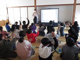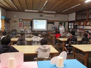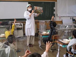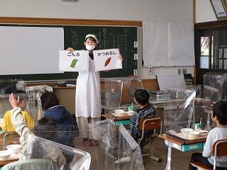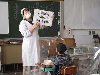 11月24日(水)、今年度初めて乾栄養教諭さんが食育指導に来てくださいました。今日のテーマは和食にちなんだお話で、今日の給食のメニューのすまし汁やひじきと豆の煮物に使われるおだしの話でした。子どもたちは、和風のおだしで美味しく味付けされた給食をもりもり食べていました。