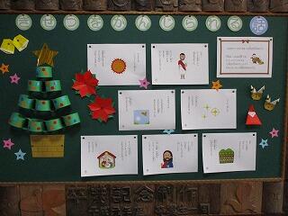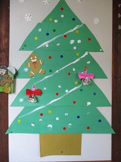 いづみ学級の教室前に大きなツリーが飾られています。すべて手作りでシールや指スタンプ、鈴はカップを使って作りました。ステキなクリスマスになるといいですね。