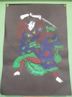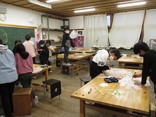 6年生が図工で木版画で多色刷りを行いました。テーマは伝統文化で、下絵を線掘りして各部分に着色しながら刷り上げていきました。