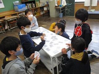 11月9日(火)、毎週火曜日は全校での遊びです。今日はあいにく朝から冷たい雨が降っていたので、各教室に分かれてなかよし班遊びをしました。定番になっている「だるまさんが転んだ」やカルタやトランプゲームなど、なかよし班で時間いっぱい楽しみました。