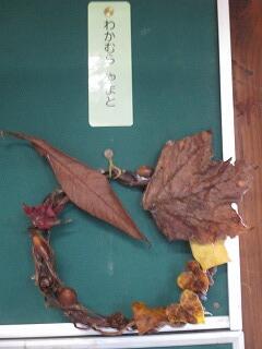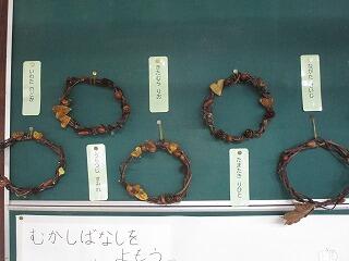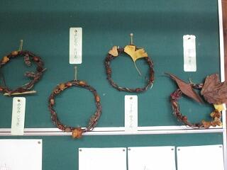 1年生が、育てた朝顔のつるを使いリースを作りました。飾り付けは地域で拾ってきた木の実や葉っぱです。クリスマスに向けステキなリースが完成しました。