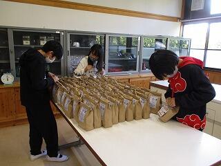 5年生が総合的な学習の時間に学んできた米作りのまとめとして、収穫した恭仁っ子米を袋詰めしました。米袋も手作りで、お米のおいしさが伝わるステキな物ができました。このお米は、お世話になっている方々に贈り感謝の気持ちを伝えます。