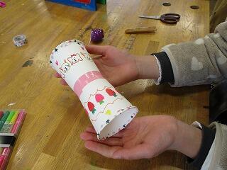 創作では、紙コップを使ってけん玉を作りました。絵を描いてできあがったオリジナルけん玉を使って、けん玉遊びに夢中になっていました。