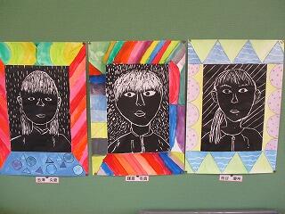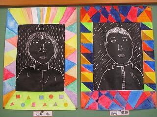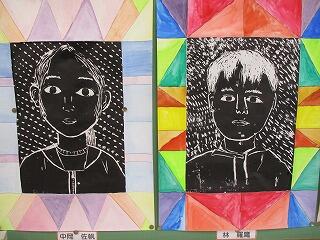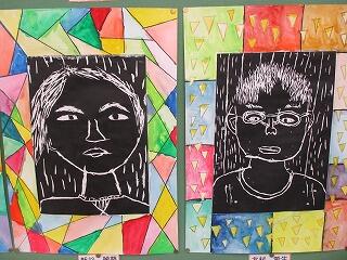 4年生は、図工の学習で版画に取り組みました。彫刻刀を使って線彫りを中心に自分の肖像画を彫りました。刷り終わった版画を自分のデザインしたカラフルな台紙に貼り仕上げました。