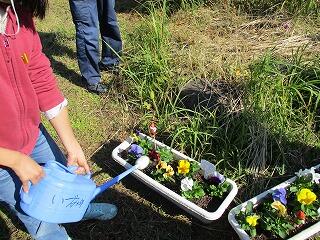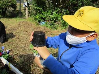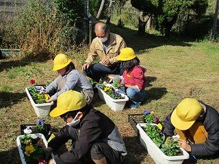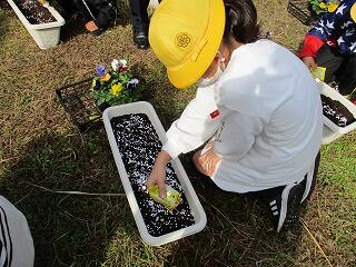 11月1日(月)の2校時に大原種苗の方にご来校いただき、京都府花き振興ネットワーク事業の一貫で花育授業をお世話になりました。花の種類や植え方などを丁寧に説明いただき、実際に色とりどりのパンジーの花植えをしました。子どもたちの感想に、花の名前が知れてよかったことや、種のまき方や花の種類が多いことに驚いたことなど、そして、水やりをしっかりします!と、体験学習を通じて植物への優しい気持ちも学びました。