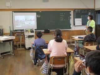 10月25日(月)の朝から、黄金色に実った稲を刈り取ります。初めて稲刈りに挑戦する1年生は、6年生とペアを組んでいろいろサポートしてもらいながら取り組みます。そのための事前指導を総合的な学習の時間で取り組んでいる5年生が、全学年に教えに各教室に行きました。