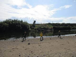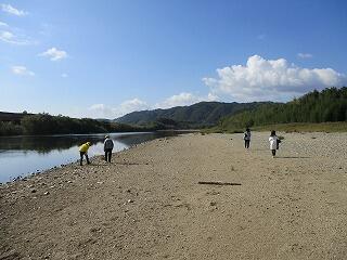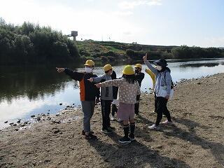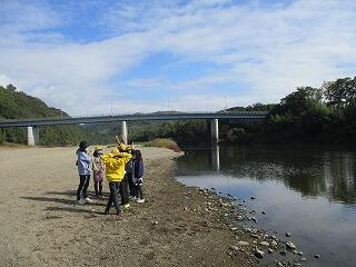 理科で学習した「流れる水のはたらき」を実際に観察するため、恭仁大橋近くの木津川河川敷に行きました。流れの外側と内側で河原の地形が違うことや石の大きさや形が林間学習の時に見た川の上流付近と違うことに気づきました。