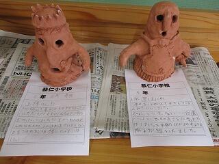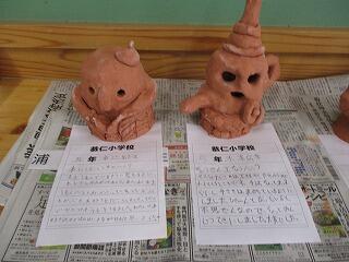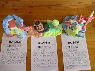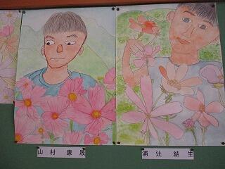 9月に入って図工で取り組んでいた5年生の絵画「コスモスとわたし」や焼き物の埴輪が仕上がりました。秋になると恭仁小学校の周りには色とりどりのコスモスが風に揺れ、秋の訪れを知らせてくれます。5年生は恭仁の風景であるコスモスと自分や友達を描きました。焼き物は埴輪に挑戦です。イメージした埴輪は、個性豊かでユニークな物ばかり、見とれて思わず微笑んでしまいます。